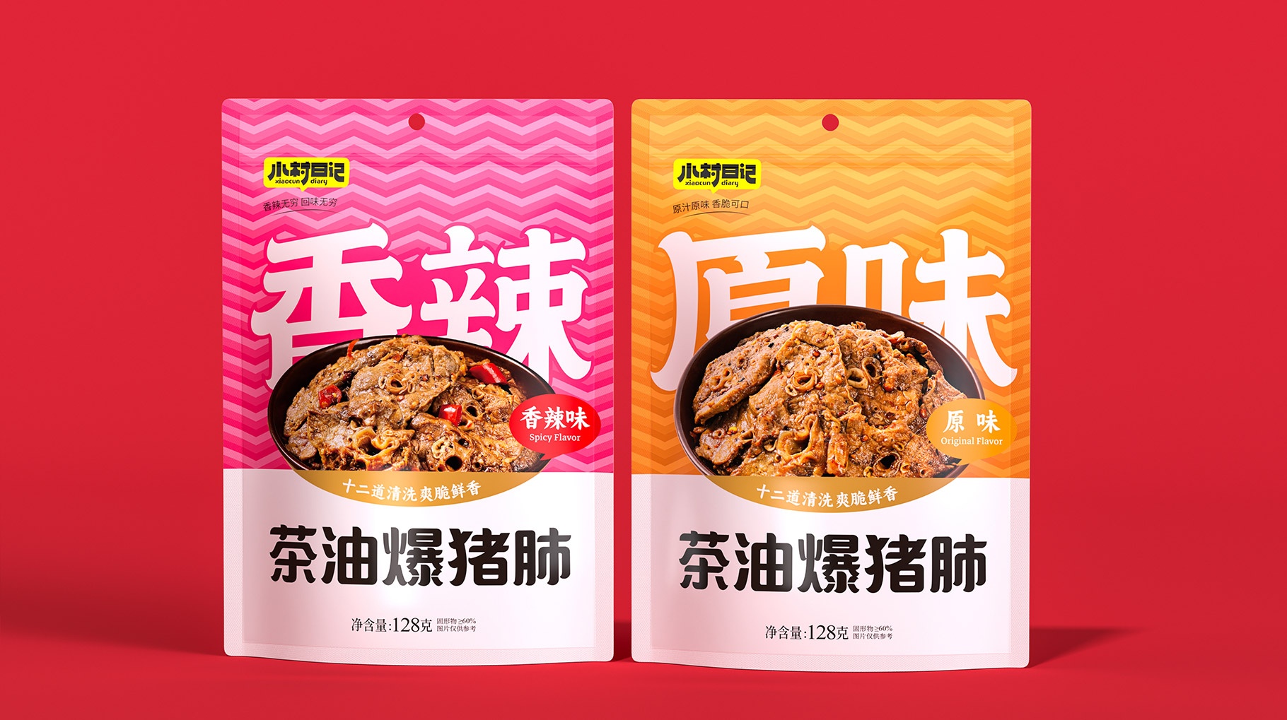 一、口味是設計休閑預制食品產品包裝時需要考慮的重要因素之一。口味的信息傳遞是從視覺上喚起消費者對產品的第一認知。所以小村日記的花腸及豬肺類產品第一思考設計核心需求是喚起消費者的味覺欲望。