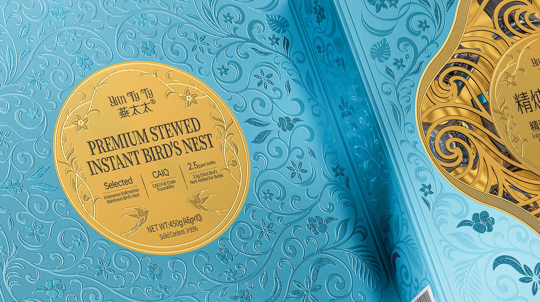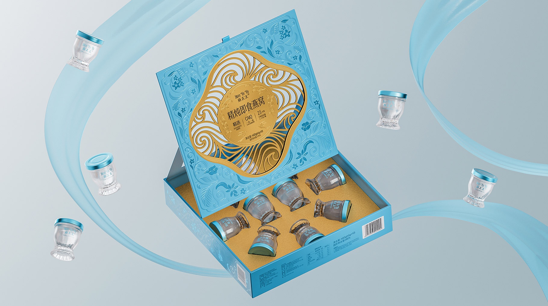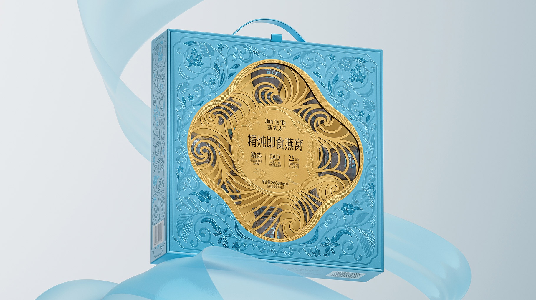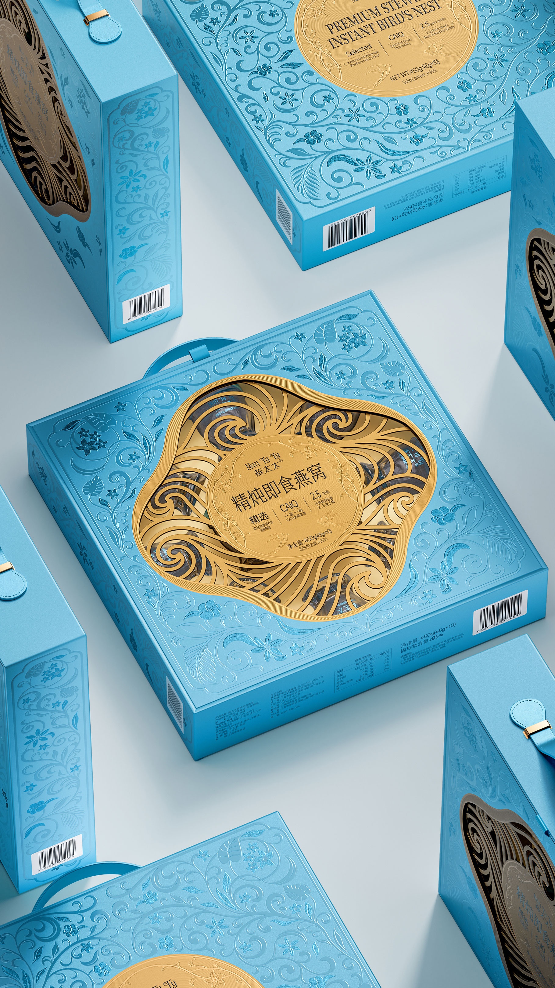整體包裝創(chuàng)意以獨創(chuàng)三層視覺敘事:中部采用東方園林“框景”手法打造鏤空視窗,湖藍(lán)色藤蔓紋樣層疊延展,再現(xiàn)雨林生態(tài)的呼吸韻律,虛實交錯間透現(xiàn)燕窩瑩潤質(zhì)感。