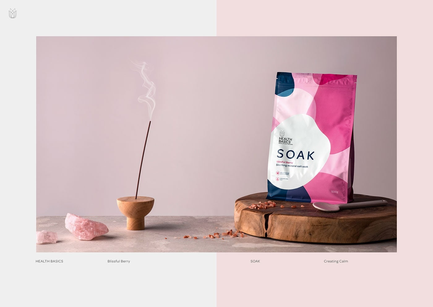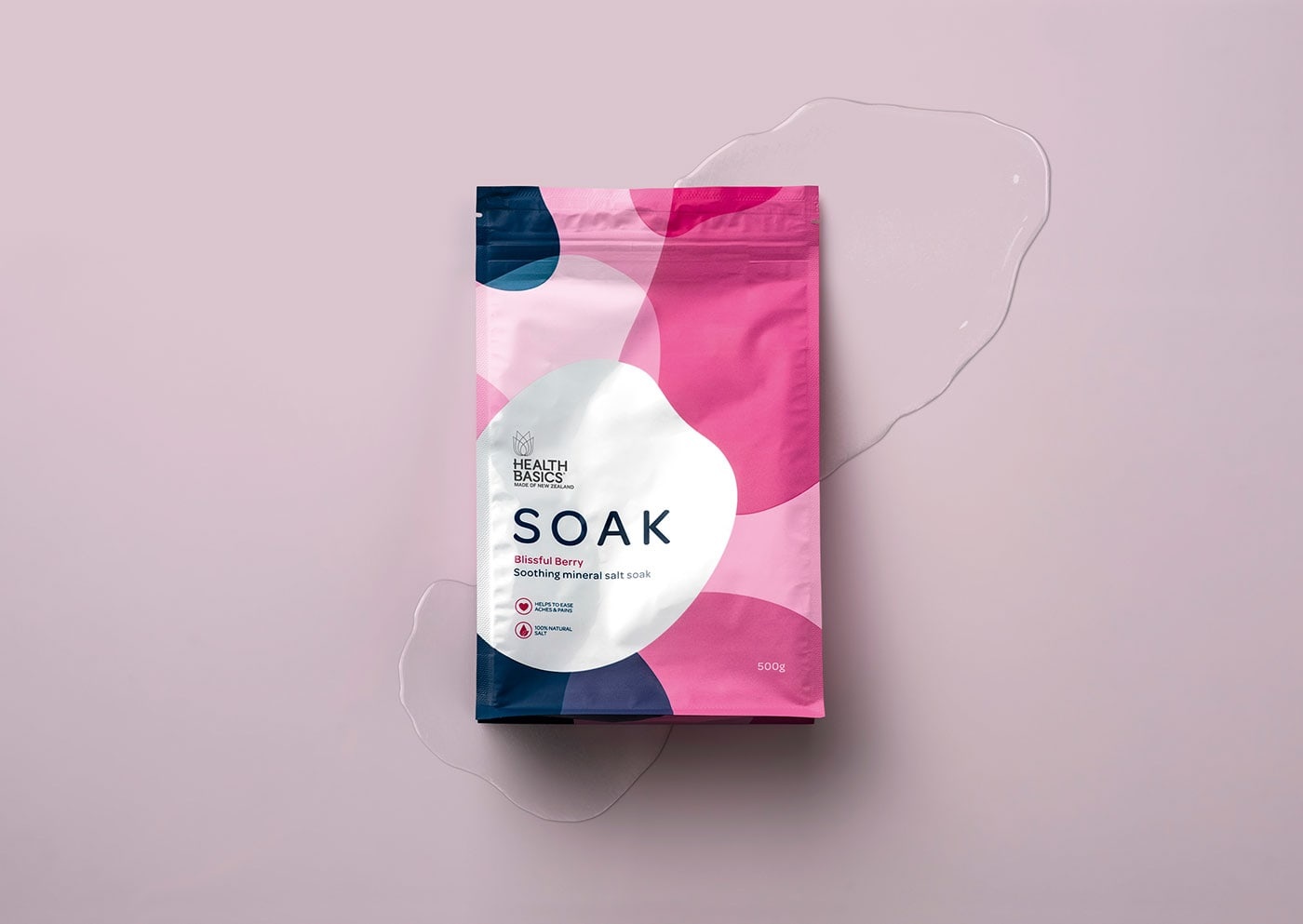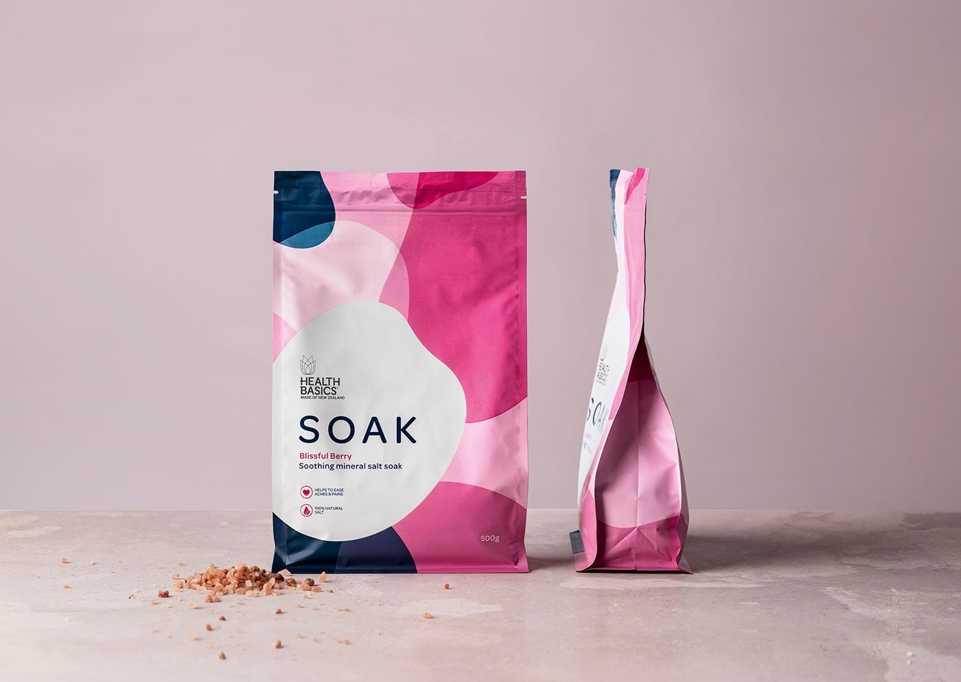包裝設計公司設計了健康基礎鹽“浸泡” -舒緩礦物鹽品牌。Health Basics希望在其產品系列中引入兩種新產品:沐浴露和沐浴鹽。如您所料,品牌和直通在這兩個類別中都起著舉足輕重的作用。